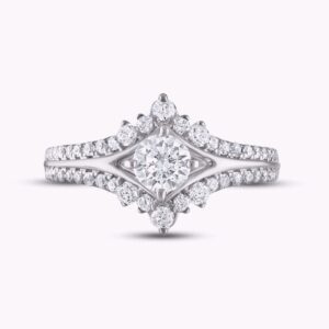 Elegant and enchanting, this engagement ring for her showcases a 1/2-carat round center diamond that sparkles between chevrons of cool 14K white gold. Shimmering round diamonds add allure to the edges and sweep down to adorn the band. The ring has a total diamond weight of 1 carat.
